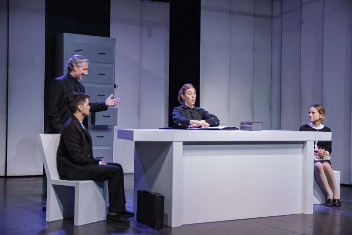La obra comienza con una pareja sentada de extremo a extremo en un gran escritorio blanco. Detrás, en el tercer plano, hay un archivo donde están todos los documentos, fichas y demás información que maneja la Fundación. La escenografía a cargo de Ariel Vaccaro y el vestuario diseñado por Alejandra Robotti permiten hacer una posible deducción sobre la elección de colores a base de negro y blanco, asumiendo una postura que podría redefinir toda la pieza: estás de un lado o estás del otro, a favor o en contra. La única pieza de la escenografía que tiene un color diferente es el archivador gris, en el cual, si se dimensiona un poco, podría sugerir el artículo número 14 de El Pacto Internacional de Derechos Civiles y Políticos, el cual dice: toda persona acusada de un delito tiene derecho a que se presuma su inocencia mientras no se pruebe su culpabilidad conforme a la ley. Sin embargo, en la dramaturgia aplica de otra manera, cambiando el orden de las palabras, es así como toda persona acusada de un delito tiene derecho a que se presuma su culpabilidad mientras no se pruebe su inocencia conforme a la ley. En la obra, el archivador representa la lista de espera tanto de padres como de hijos para ser adoptados, pero también, conforme al texto, representa la “duda” direccionada a la certeza que sobre los padres tenga la organización gubernamental de acuerdo con los fines políticos de la dictadura.