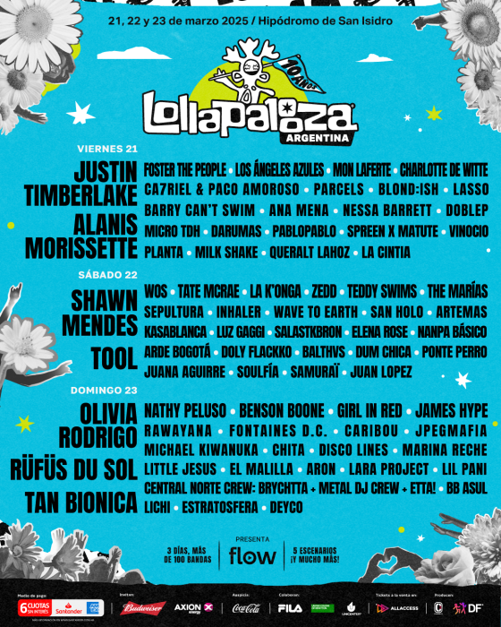 Esta gran celebración de los 10 años del festival pretende hacer honor a la música en todo sentido. Así, el line up de este año reúne a cantantes y bandas de todo el mundo, teniendo a Olivia Rodrigo, Justin Timberlake, Shawn Mendes, Alanis Morissette, TOOL, Rüfüs du Sol y Tan Bionica a la cabeza, sumando una gran cantidad y variedad de artistas para las 3 fechas como Foster the People, que presentan su nuevo disco Paradise State of Mind, Los Ángeles Azules con su cumbia mexicana, Ca7riel & Paco Amoroso, el famoso dúo argentino de música urbana, Mon Laferte, Parcels o Lasso, por mencionar algunos. Acá debajo dejamos el line up completo por fecha.